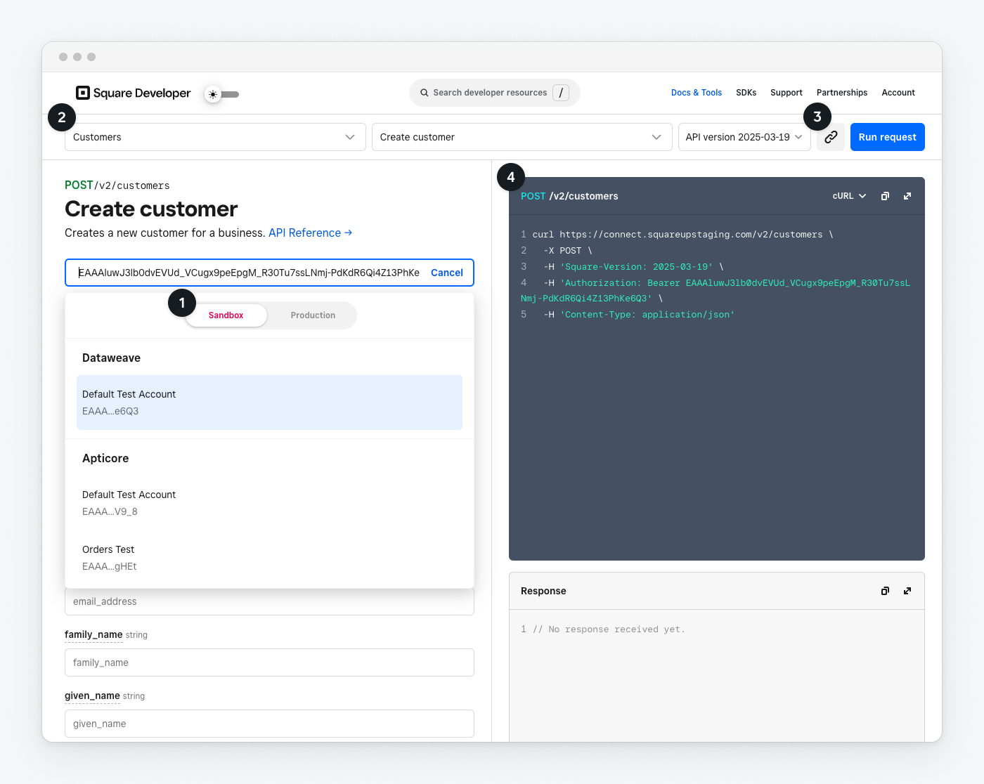 Authorizationheader of your requests.For this exercise, keep Sandbox selected. Square recommends using the Square Sandbox to test Square APIs when possible. For more information, see Test access permissions.