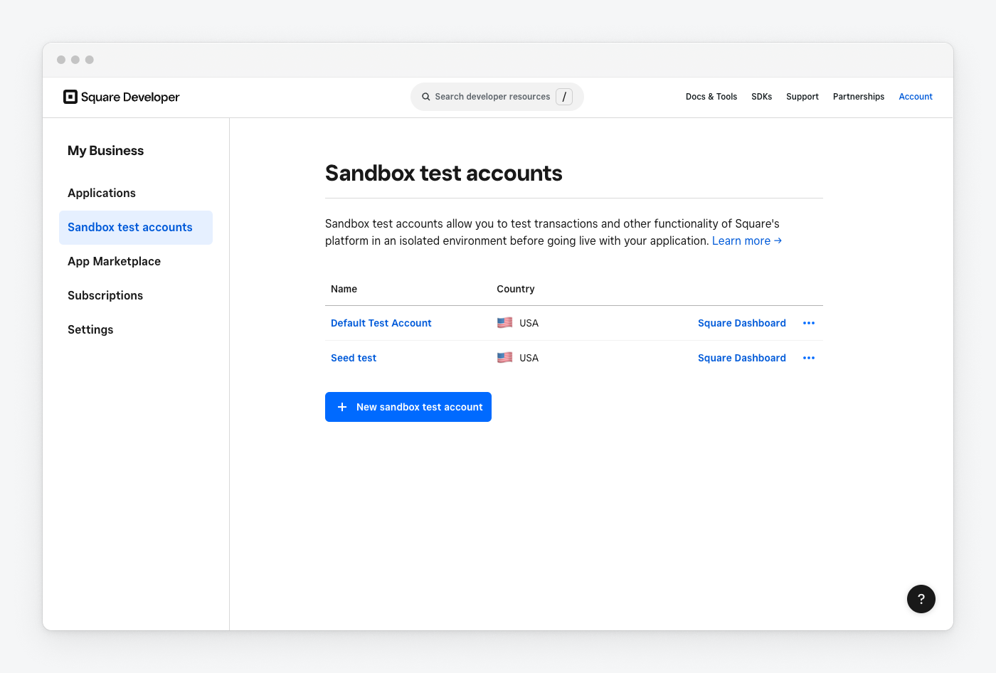 On the Sandbox test accounts page in the Developer Console, choose Square Dashboard next to Default Test Account. This link opens the Sandbox Square Dashboard associated with the default test account.