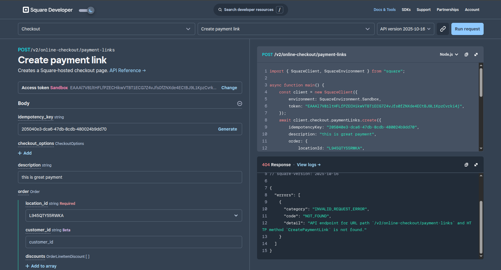 I am trying to create payment link using Checkout’s Create payment link api and it is giving me this error, I am currently on sandbox environment. Even this error is occuring on Square’s API Explorer Portal